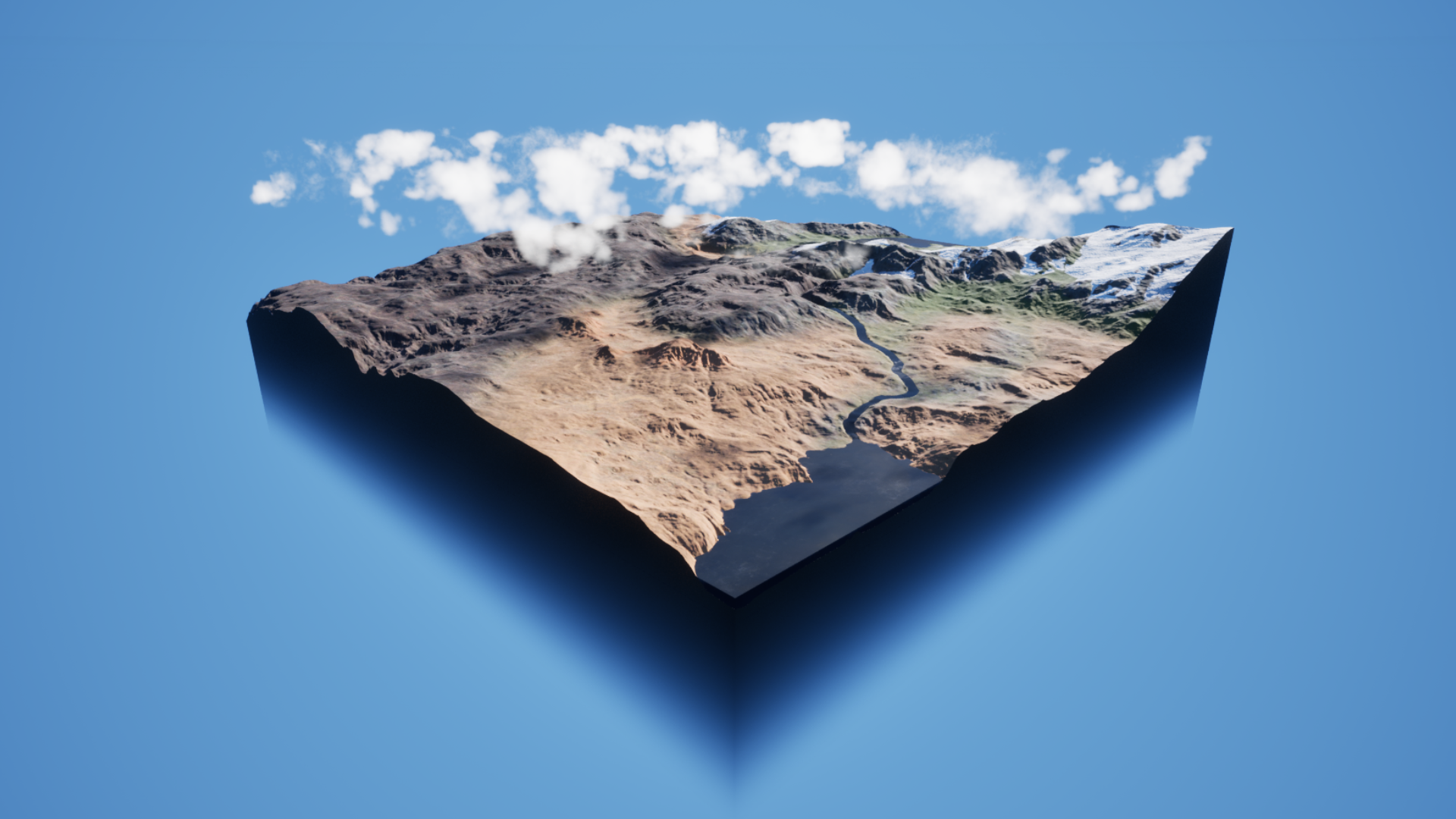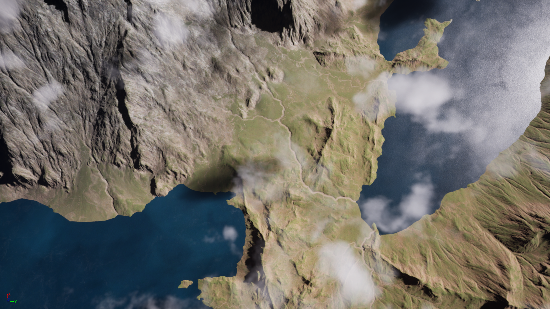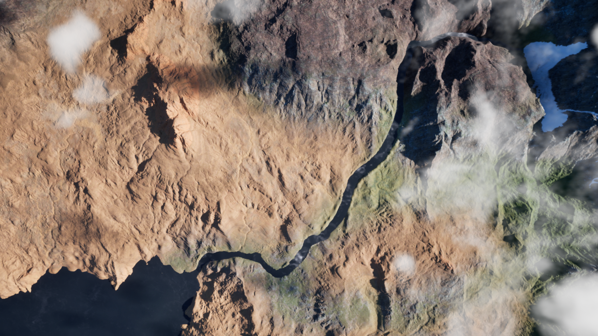 My general workflow when creating terrain to produce heightmaps using Quadspinner Gaea, add additional procedural features such as rivers, paths, and clouds in Houdini, then set up detailed landscape materials in Unreal Engine.