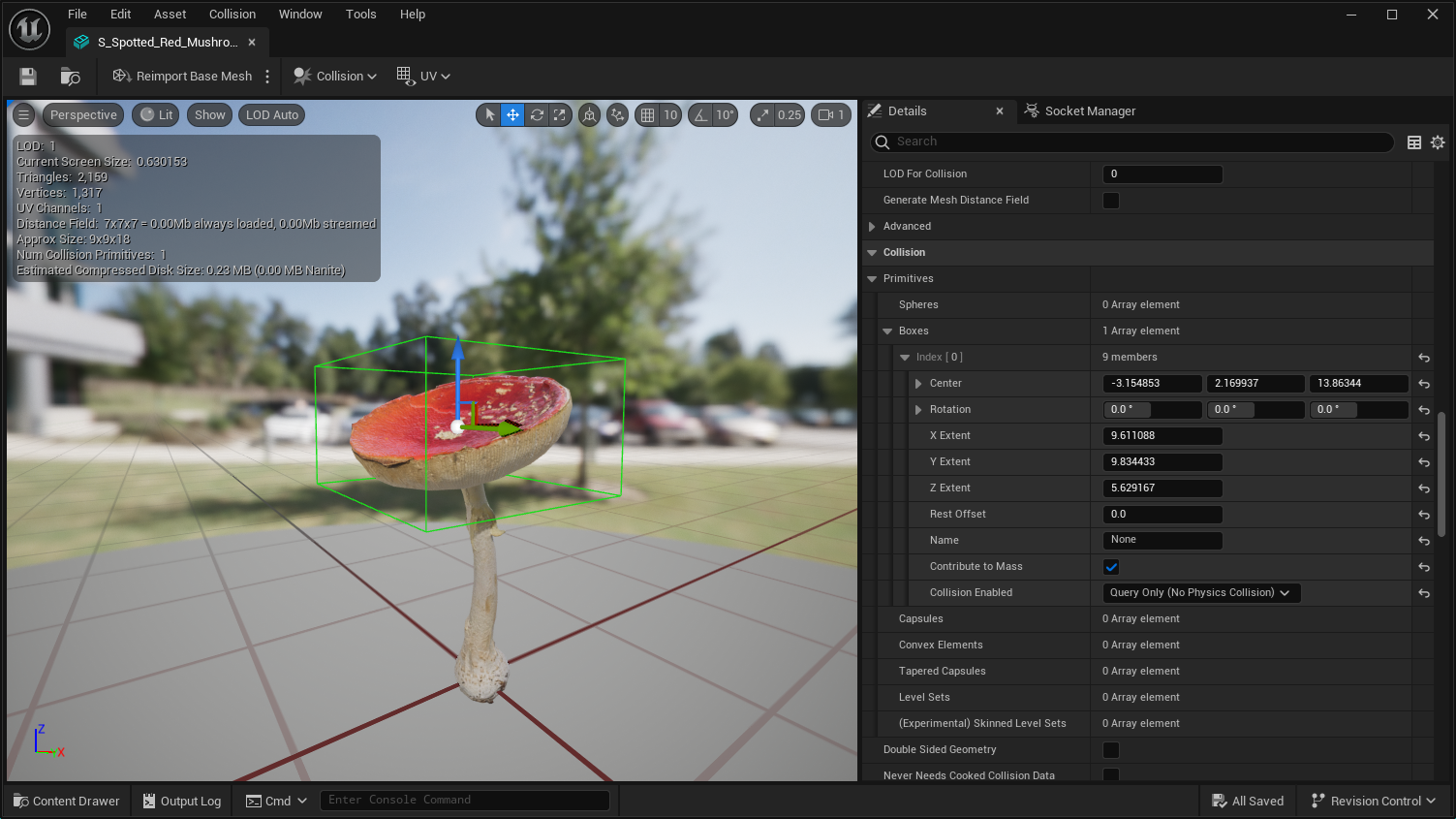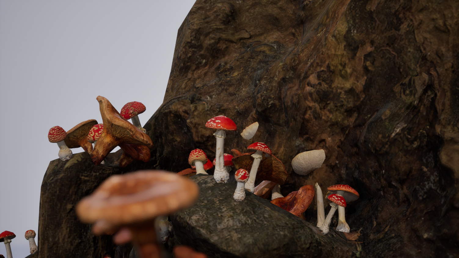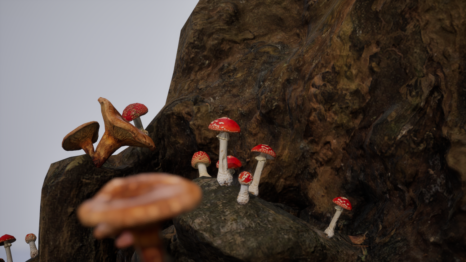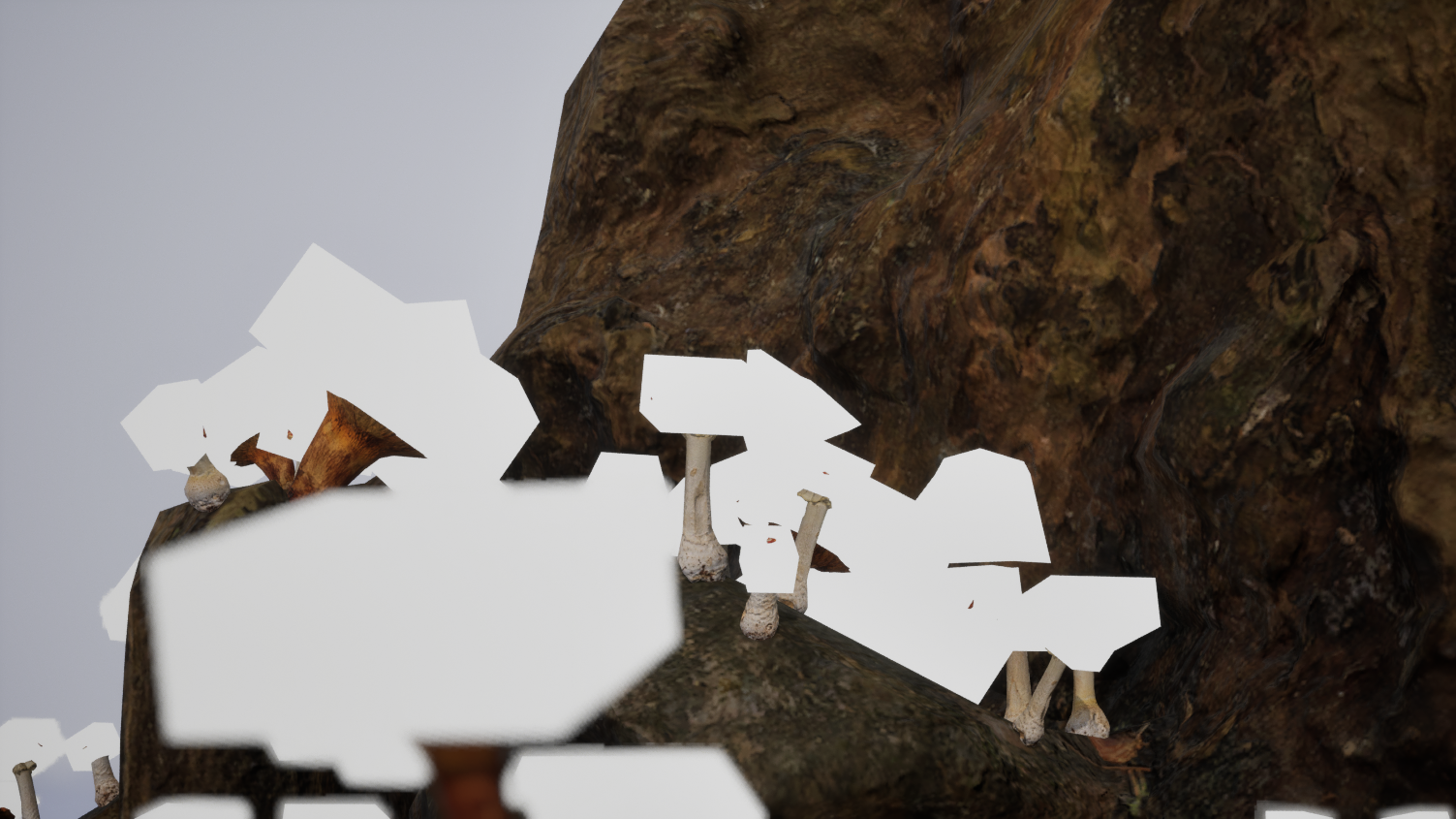 One interesting problem I ran into was that occasionally the mushrooms would clip into the tree stump mesh. I needed a way to detect intersections of the mushroom caps with the tree stump, while ignoring the mushroom stalks (these are okay to intersect). In this case, doing a simple bounding box detection is not enough.