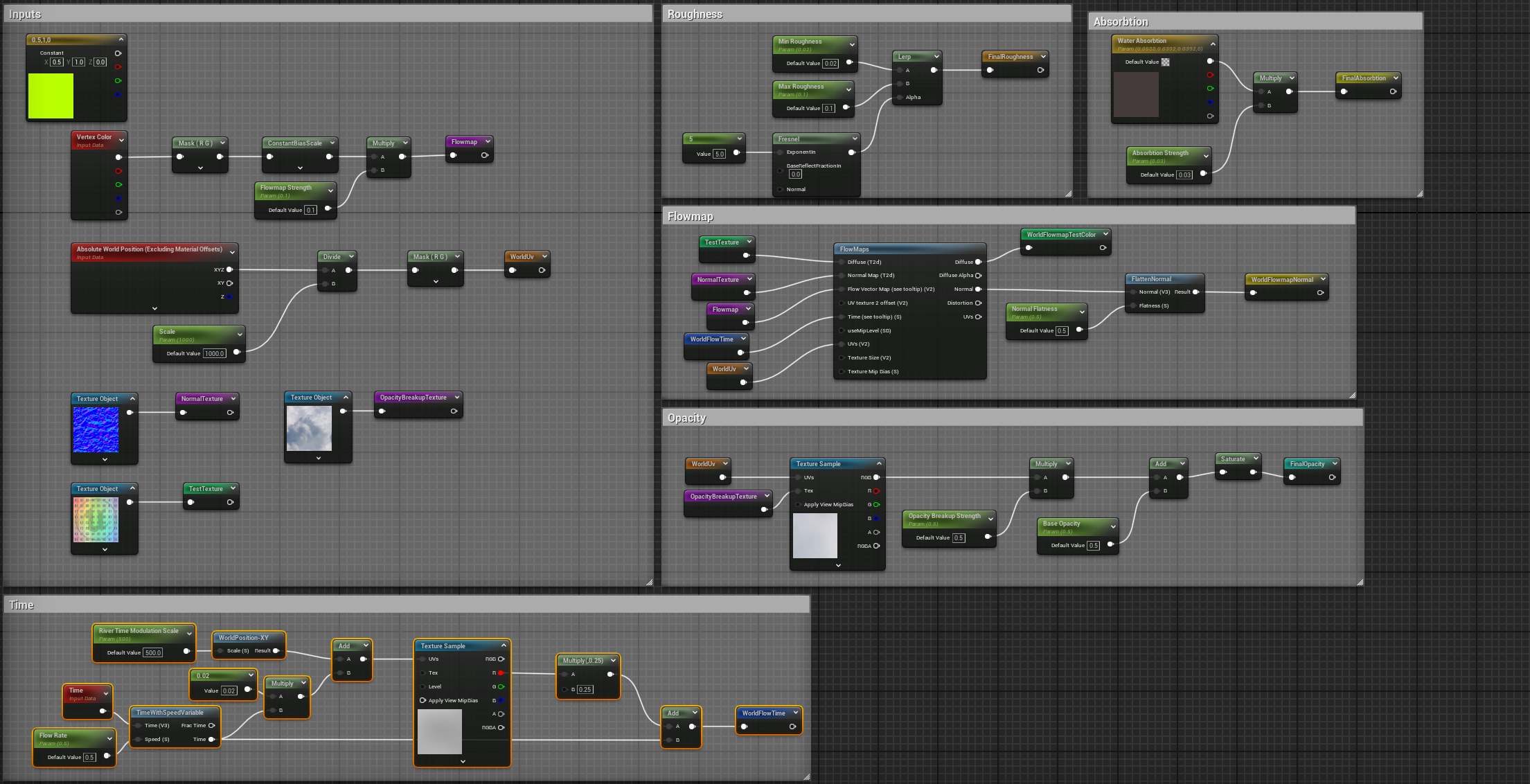 For the river material, I created a simplified version of the water material included in the UE Water System Plugin.
