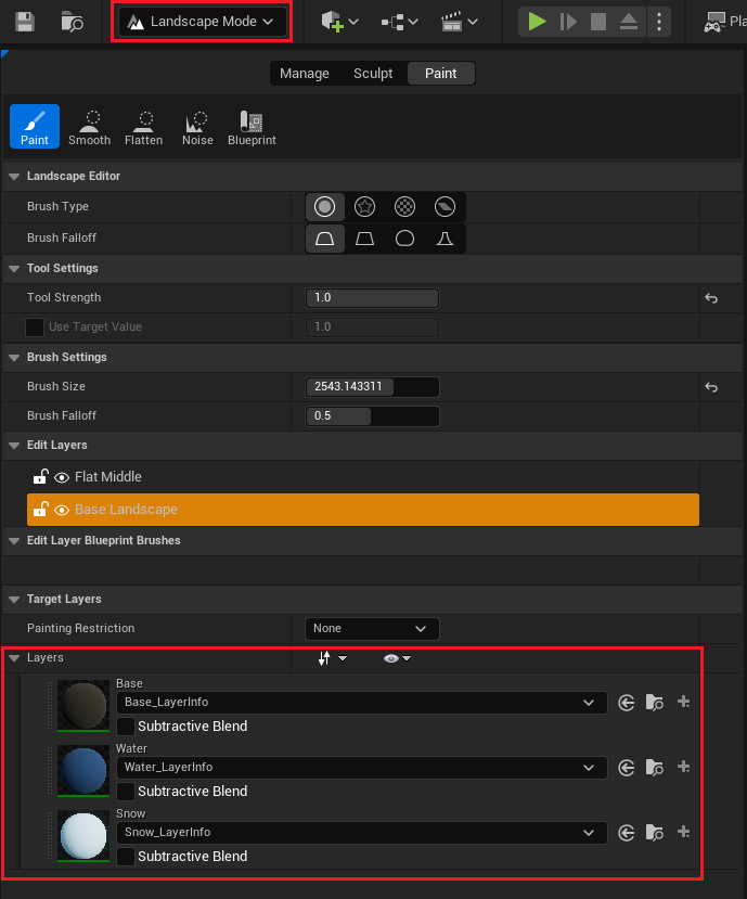 Whatever layer names you type into the details panels for either of these nodes will be the same names you see for the paint layers in the landscape editor. For more information about these nodes, see the Landscape Layer Blending section below. Also, you may notice that when you try to use your paint layers in the landscape editor, it wants you to create a “LayerInfo” object. For more information about that, see the Landscape Layer Editor Blend Type section below.