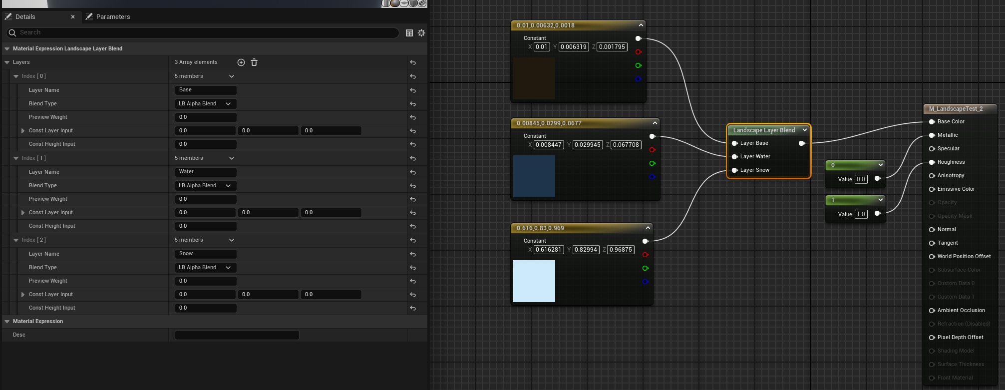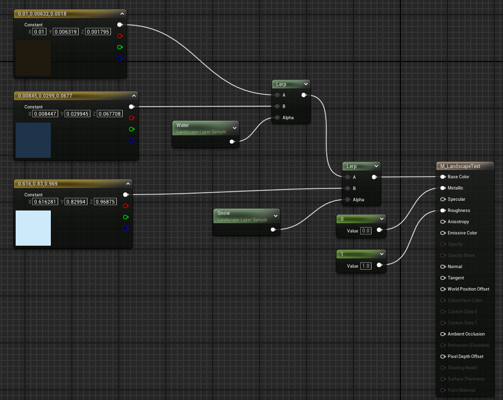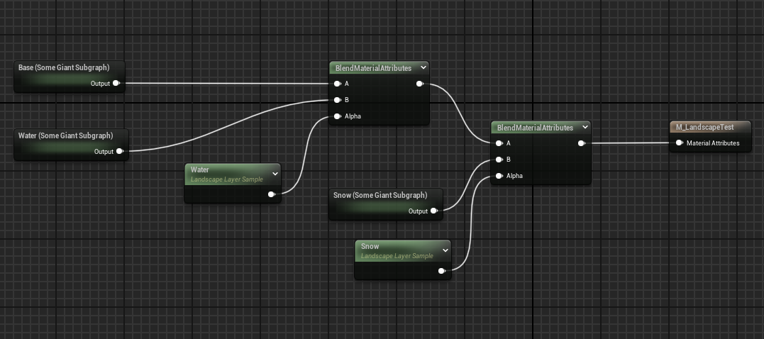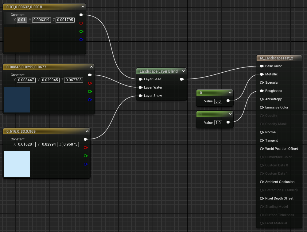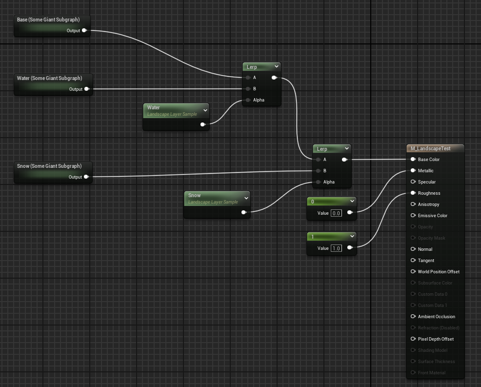 Also note that you don’t have to do something as simple as blending in a flat color or a single texture sample. You could have an entire automaterial setup as your Base layer and then blend in some equally complex material subgraphs for your water, snow, etc.