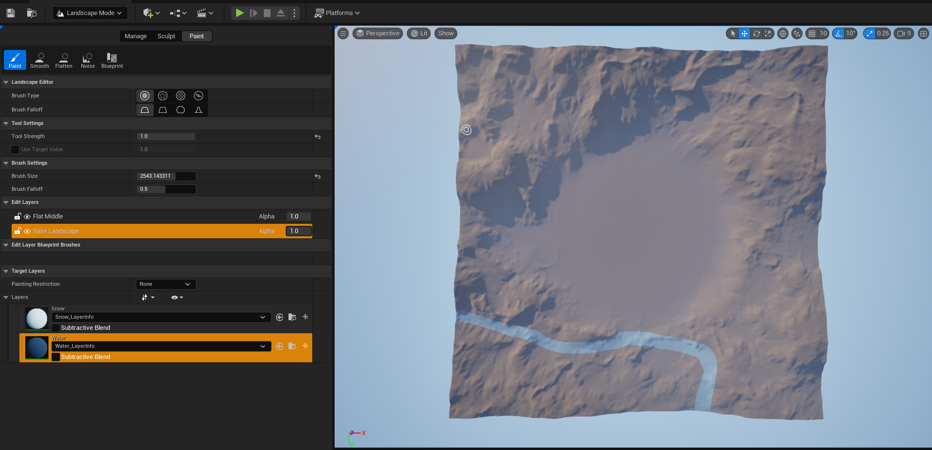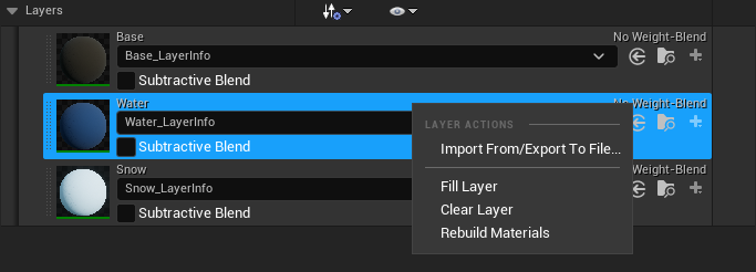 More specifically, if you create a layer with a weight blended layer editor blend type, whenever you increase the weights in a layer- i.e. paint in that layer, manually or otherwise- the unreal editor will uniformly decrease the values of the weights of all other weight blended layers currently associated with your landscape material. You can see this in action in the example video below- in the spot where I paint in snow, the base layer and water layer weights are actually erased.