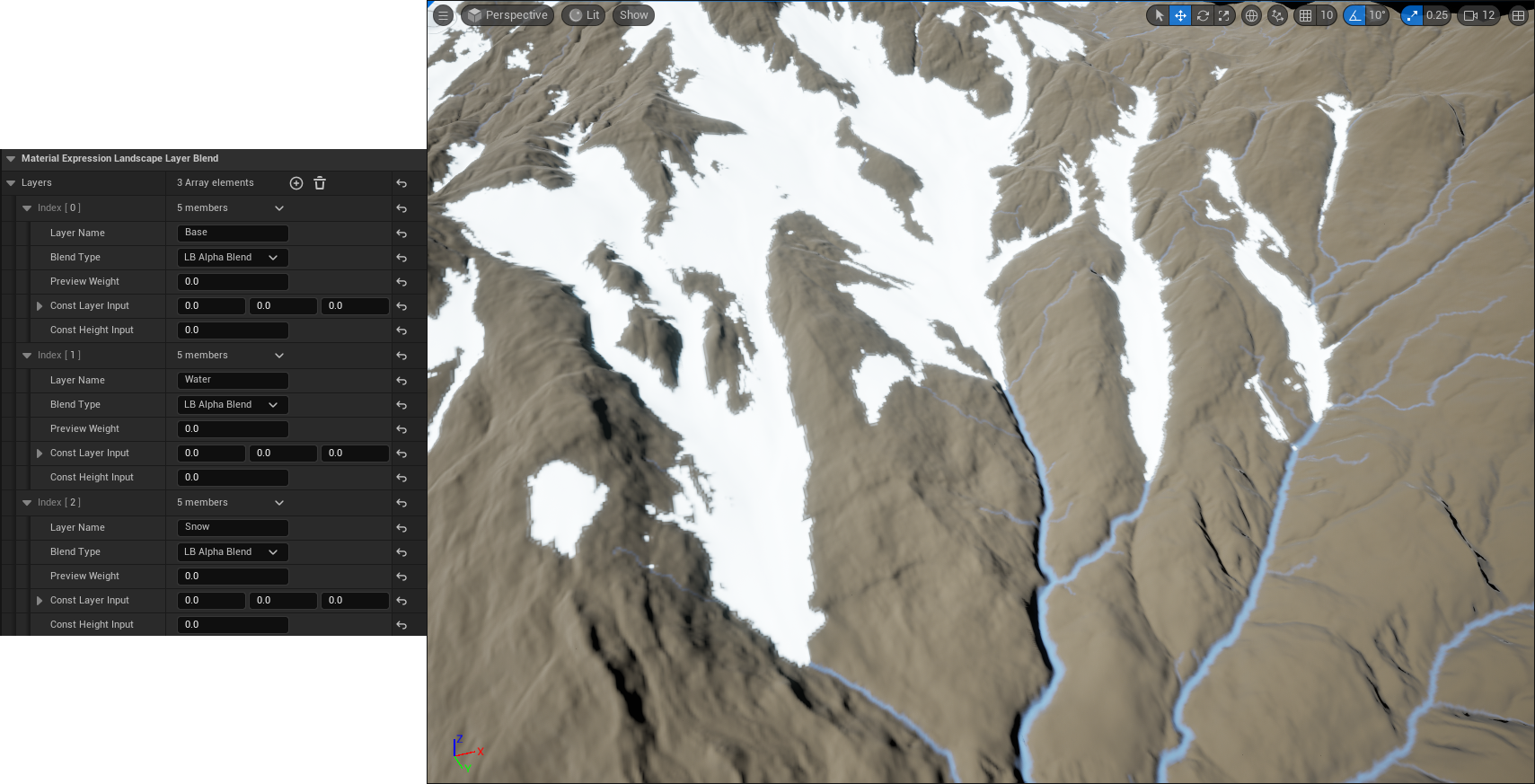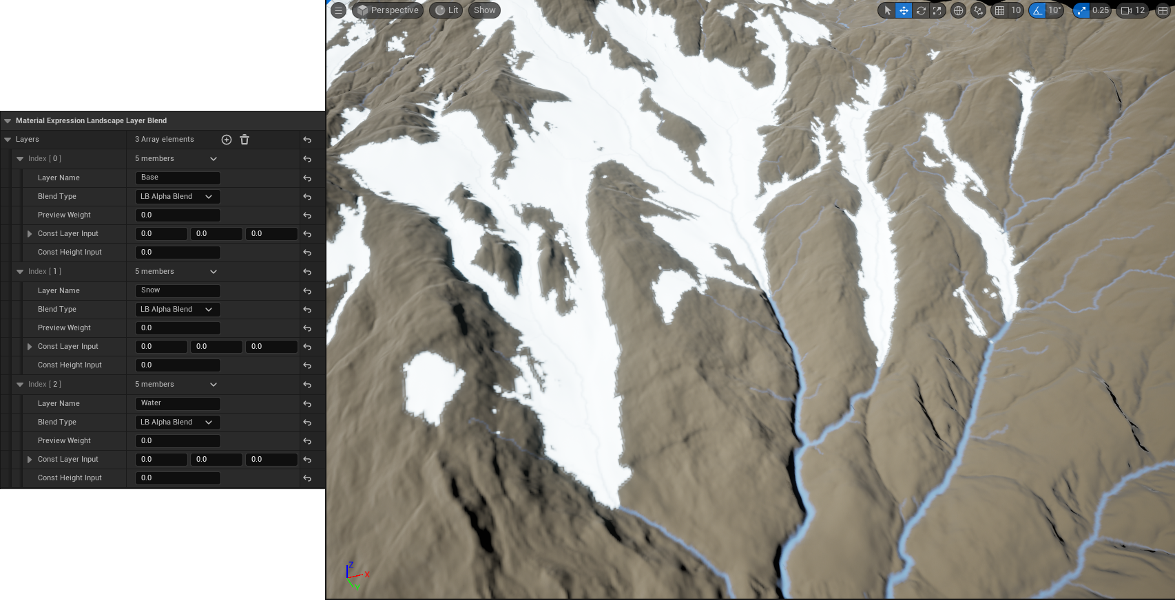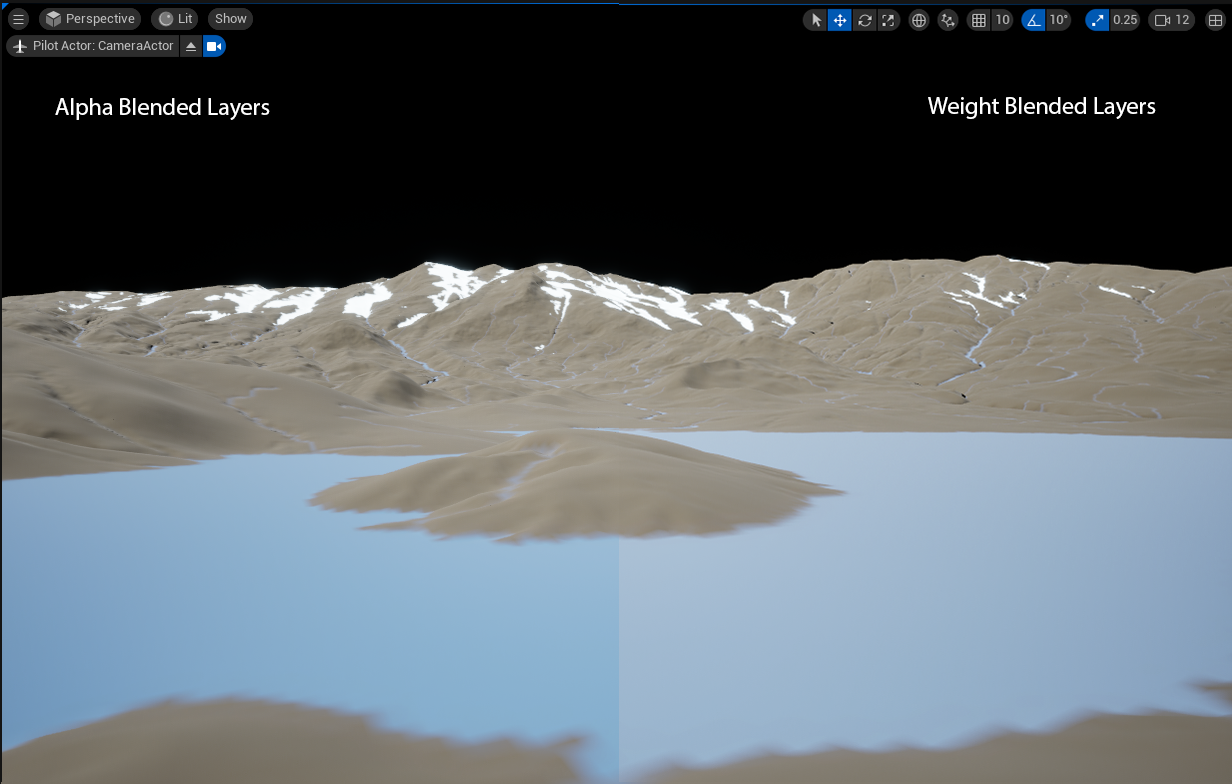 A common workflow when creating terrain in Unreal Engine is to create a complex master material that allows you to combine the various elements of your landscape (dirt, grass, rock, snow, etc) together. Understanding all your options when creating such a material can be a bit daunting, since in classic UE fashion there are multiple features with similar names that do completely different things. This document aims to give you a concise overview of the different ways you can blend your landscape materials together.